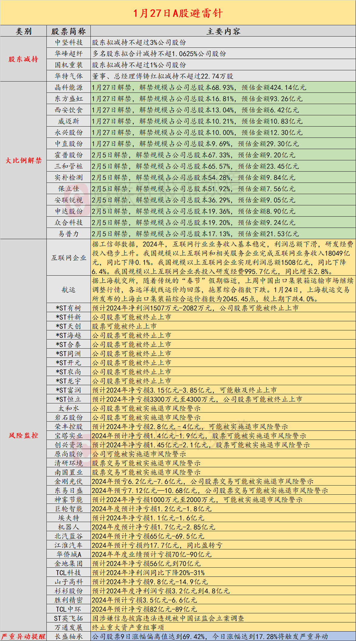 近日公告的A股拟减持的公司数量较之前有所减少,中坚科技股东拟减持不超过3%公司股份;晶科能源、霍普股份将迎来超六成以上解禁;工信部数据显示,2024年我国规模以上互联网企业实现利润总额1508亿元,同比下降6.4%;*ST有树预计2024年净利润1507万元-2082万元,公司股票可能被终止上市;国家卫健委表示,全国范围内呼吸道传染病流行情况已下降;宝塔实业2024年预计净亏损1.4亿元-1.9亿元,股票可能被实施退市风险警示;上周五美股三大指数集体收跌,英伟达跌超3%。
