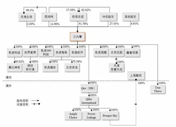 首先令投资者注意的是重组标的三六零股份有限公司(下称三六零)的股权架构。众所周知,Qihoo 360与其他回归A股的海外上市公司一样,需要先经过私有化,然后再拆除VIE结构,最后将各个业务条线重新进行整合并估值。