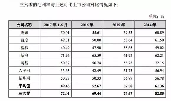 同期,三六零毛利率分别达到82.85%、76.47%、69.44%、72.01%,完全盖过腾讯、百度、搜狐、新浪、网易等一众互联网公司。