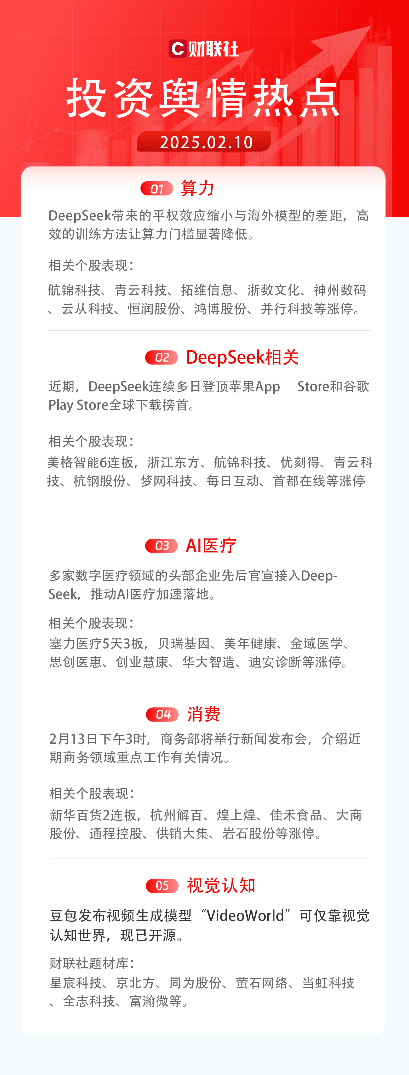3)AI医疗:多家数字医疗领域的头部企业先后官宣接入DeepSeek,推动AI医疗加速落地。