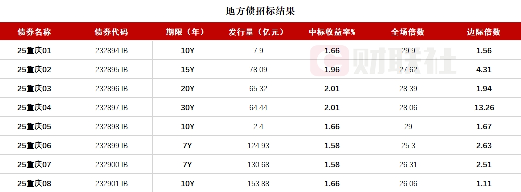 重庆市八期地方债已结束招标 中标利率均在25倍以上