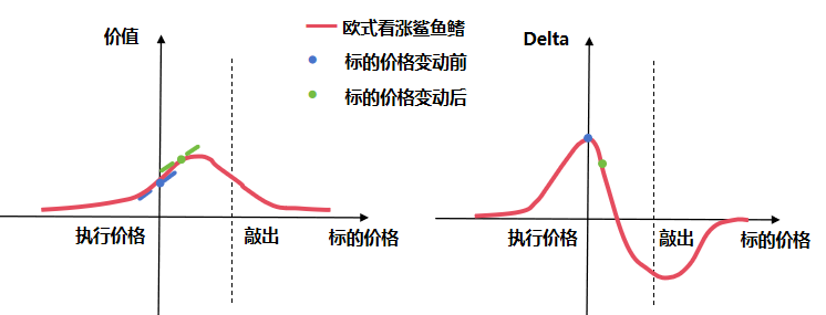 具体地,我们以买入欧式看涨鲨鱼鳍为例来说明Delta对冲的过程。下面是一个欧式看涨鲨鱼鳍的对冲示意图,左图是它的价值曲线,右图是Delta曲线。左图中,蓝点所在的位置标注了当前的标的价格及其对应的期权价值,它的Delta是蓝色虚线的斜率,数值大小对应了右图中的蓝点,记为Δ0。在标的价格发生微小变动的时候,期权价值大致上沿着蓝线方向变化。因此,按照Delta对冲的逻辑,当前应该持有-Δ0份的标的资产,使期权价值的变化和标的资产价值的变化正好抵消,即当期权价值以Δ0的速度上升时,这部分标的资产的价值会以Δ0的速度下降,反之亦然。