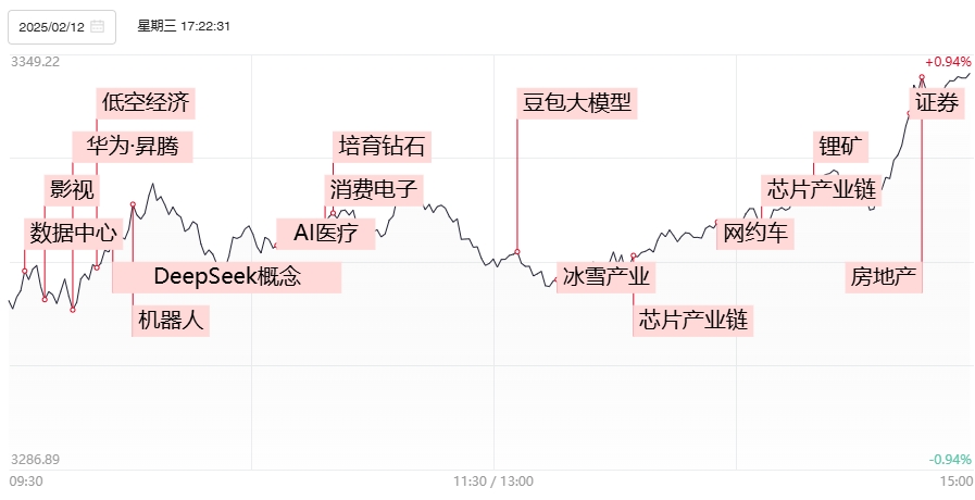财联社2月13日电,市场全天震荡走高,创业板指领涨。个股涨多跌少,全市场超3500只个股上涨。沪深两市全天成交额1.68万亿,较前日放量413亿。1)据科技媒体The Information援引消息人士报道,苹果公司正与阿里巴巴公司合作,开发和推出面向中国iPhone用户的人工智能。杭钢股份、梦网科技、浙数文化等同时叠加阿里云和DeepSeek概念的前排核心继续实现连板晋级,并继续加强云计算和算力租赁等推理算力细分。2)消费电子板块近期在多重催化下持续走强,港股AIPC龙头联想集团以及国内龙头华勤技术双双创出历史新高,在小米、华为等国内品牌市占率持续提升下,手机细分也将持续释放业绩。此外午后半导体产业链也批量爆发,受到消费电子和智能驾驶需求双重提振的CIS芯片龙头韦尔股份涨停并创出2022年4月以来新高,另外射频和Soc方向的走强也主要以消费电子等端侧硬件驱动为主。3)机器人板块指数在连续高位震荡后继续反包向上,冀凯股份、冀东装备两只前期人气龙双双涨停,兆威机电、巨轮智能、卧龙电驱等续创历史新高。4)猫眼专业版的最新票房预测数据显示,《哪吒之魔童闹海》总票房将超160亿元。票房预测值的不断刷新刺激光线传媒股价持续爆发,收出近6天的第4个涨停,市值突破700亿元,此外相关的院线、IP文创等方向也迎来批量补涨,文创IP概念股金运激光收获20CM2连板。