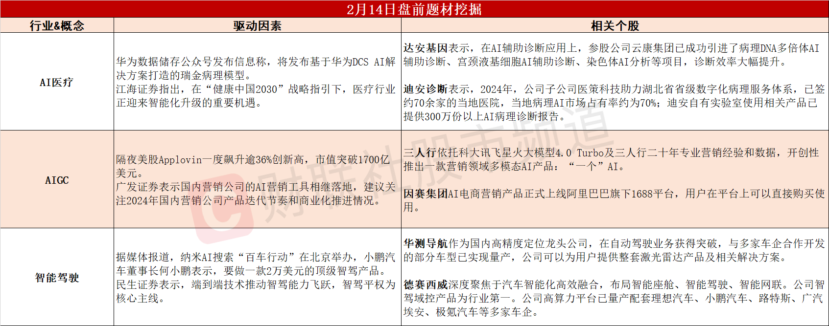 ①华为将发布AI病理模型,医疗行业迎来智能化升级重要机遇。②美股Applovin一度飙升逾36%创新高,AI营销变现能力远超市场预期。③各家厂商积极推进智驾普及,高阶智能驾驶渗透率有望加速提升。