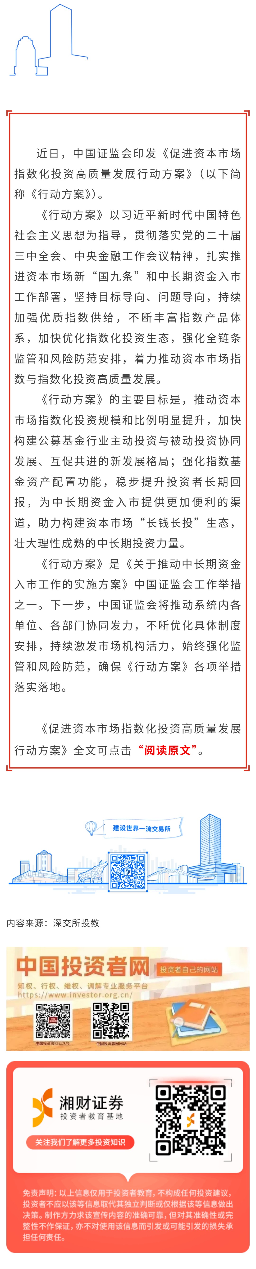 【深交所投教】中国证监会印发《促进资本市场指数化投资高质量发展行动方案》