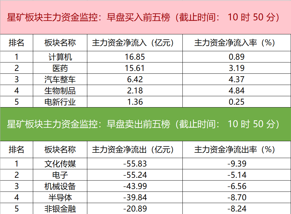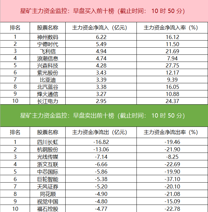 财联社2月14日电,财联社星矿数据显示,今日早盘主力资金净流入计算机、医药、汽车整车等板块,净流出文化传媒、电子、机械设备等板块,其中文化传媒板块净流出超55亿元。个股方面,神州数码涨停,主力资金净买入6.22亿元位居首位,宁德时代、飞利信、浪潮信息获主力资金净流入居前;四川长虹遭净卖出超16亿元,杭钢股份、光线传媒、浙文互联主力资金净流出额居前。