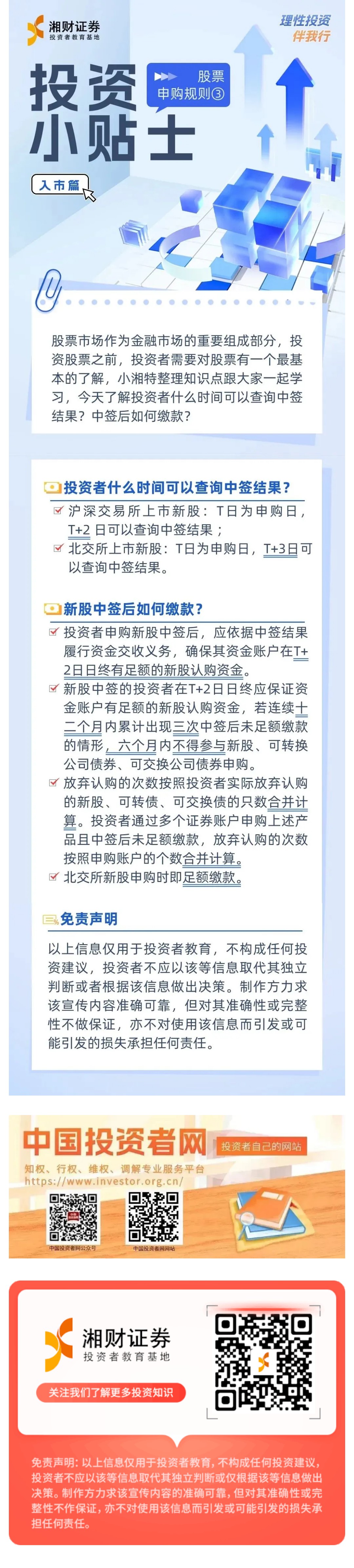【理性投资伴我行 | 投资小贴士】投资者参与新股申购什么时候可以查询中签结果?中签后如何缴款?