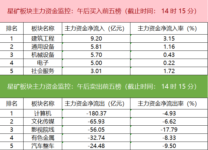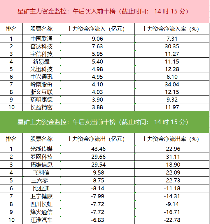财联社2月17日电,财联社星矿数据显示,今日主力资金净流入建筑工程、通用设备、机械设备等板块,净流出计算机、文化传媒、影视院线等板块,其中计算机板块净流出180.37亿元。个股方面,中国联通午后触及涨停,主力资金净流入9.06亿元居首位,奋达科技、宇信科技、新易盛获主力资金净流入居前;光线传媒遭净卖出43.46亿元居净流出首位,梦网科技、拓维信息、飞利信等主力资金净流出额居前。