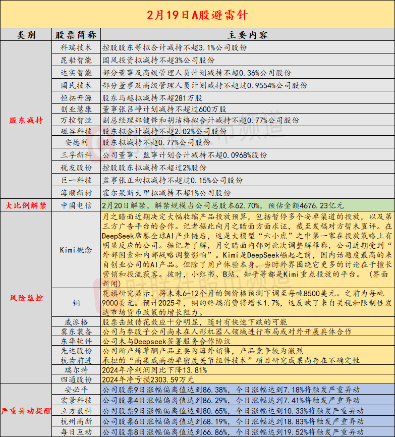 昨日公告的A股拟减持的公司数量较之前有所减少,科瑞技术控股股东等拟合计减持不超3.1%公司股份,昆船智能股东国风投资拟减持不超3%公司股份;中国电信将迎来超六成以上解禁;大砍投放预算,DeepSeek冲击之下月之暗面Kimi暂缓“烧钱”;6连板威派格公告,股票击鼓传花效应十分明显,随时有快速下跌的可能;险企披露最新偿付能力,7家公司“亮红灯”;16天10板冀东装备表示,公司与参股子公司尚未在人形机器人领域进行布局或对外开展具体合作;特朗普称,将对进口汽车征收25%左右的关税。