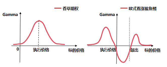 下面是一个香草期权(左图)和欧式看涨鲨鱼鳍期权(右图)的Gamma示意图。相较于其他结构复杂的期权,香草期权的Gamma有比较固定的特征。香草期权的Gamma总为正值,并且相同行权价格和到期时间的看涨和看跌期权Gamma相等。另外,香草期权在行权价格附近时Gamma最大,平值期权在接近到期日时Gamma甚至会变得无限大。