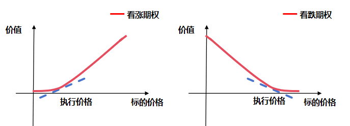 好在从Gamma和Delta的关系上来讲,Gamma似乎并不一定非得是中性,正Gamma的期权比负Gamma的期权要更好对冲一些。下图分别是看涨(左)和看跌(右)的香草期权,它们的Gamma始终为正。图中的蓝色虚线是期权价值曲线中某一点的切线,它的斜率就是该价格下的Delta。