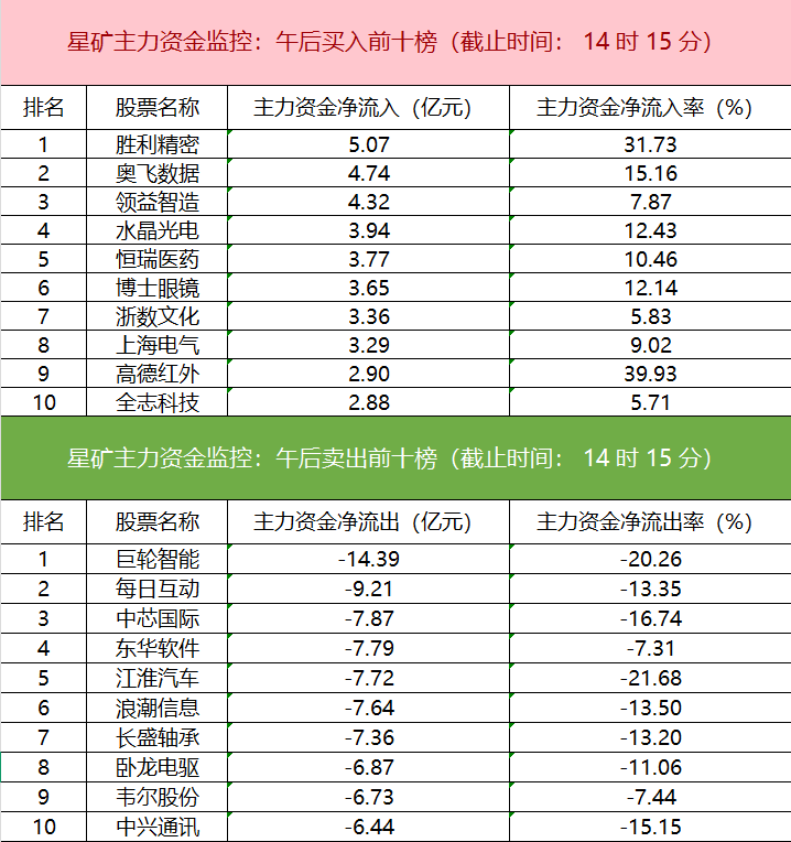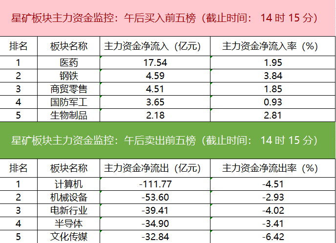财联社2月20日电,财联社星矿数据显示,今日主力资金净流入医药、钢铁、商贸零售等板块,净流出计算机、机械设备、电新等板块,其中计算机板块净流出111亿元。个股方面,AI眼镜概念股胜利精密涨停,主力资金净流入5.07亿元居首位,奥飞数据、领益智造、水晶光电获主力资金净流入居前;巨轮智能遭净卖出14.39亿元居净流出首位,每日互动、中芯国际、东华软件等主力资金净流出额居前。