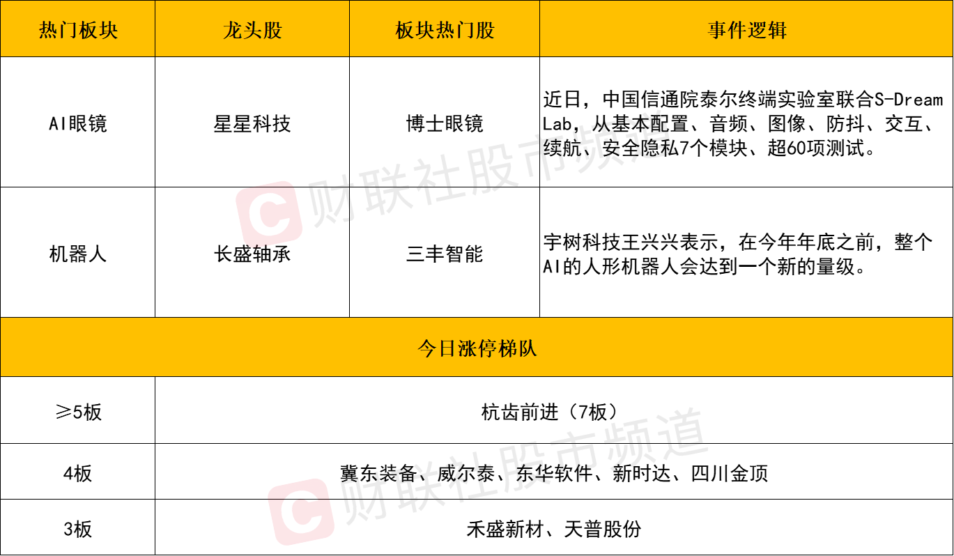 今日市场维持较强的赚钱效应,仍有逾百股涨停或涨超10%。其中AI眼镜概念股全线爆发,星星科技、博士眼镜、明月镜片等个股20CM涨停,而领益智造,歌尔股份等权重同样维持着趋势性上涨。午后在核心标的长盛轴承的带动下,机器人概念股再度活跃。长盛轴承盘中一度涨超110元,自去年2月以来股价涨超10倍。不过需注意,尾盘阶段遭遇部分的兑现抛压回落,预计短线活跃资金的多空博弈下,机器人方向短线的波动可能会进一步加剧。DeepSeek概念股走势分化,其中每日互动跌超10%,优刻得同样跌超8%。而另一方面,东华软件连续两日以超百亿的成交额涨停封板,拓维信息同样延续涨势。可见DeepSeek概念依旧维持着极高的活跃度,故当短线再度分歧回调时,仍可留意前排核心个股的低吸套利机会。