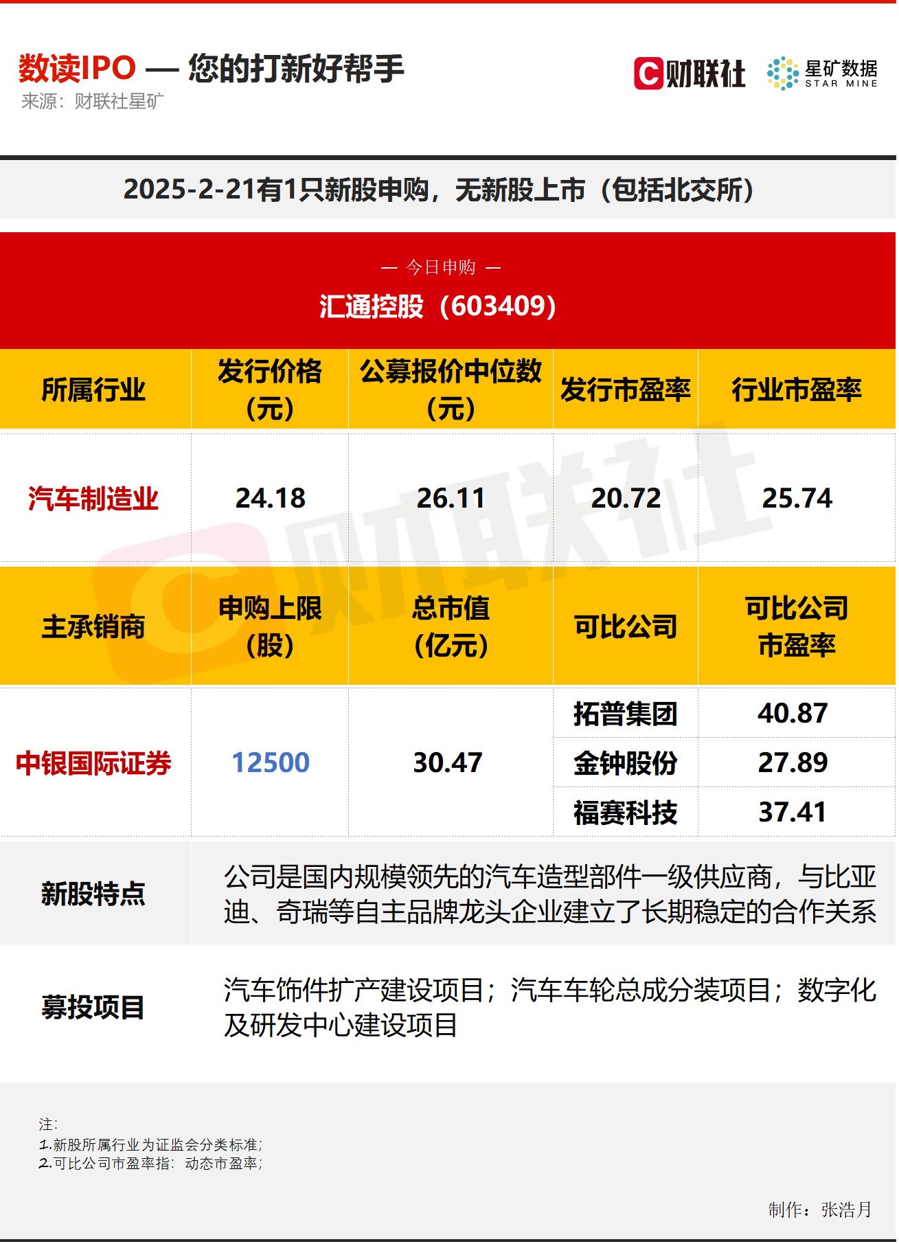 财联社2月21日电,今日有1只新股申购,为沪市主板的汇通控股;无新股上市。汇通控股主要从事汽车造型部件和汽车声学产品的研发、生产和销售。