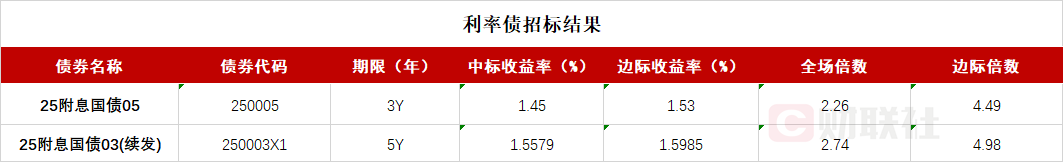财政部两期国债已招标结束 3年期品种加权中标收益率1.45%