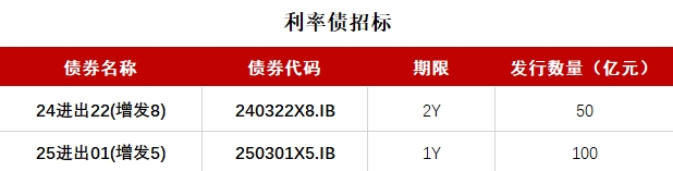 财联社2月28日电,按照此前公布的发行计划,进出口银行将于10:00-11:10招标发行两期金融债:24进出22(增发8),期限2年,发行量不超过50亿元,票面利率1.42%;25进出01(增发5),期限1年,发行量不超过100亿元,票面利率1.25%。