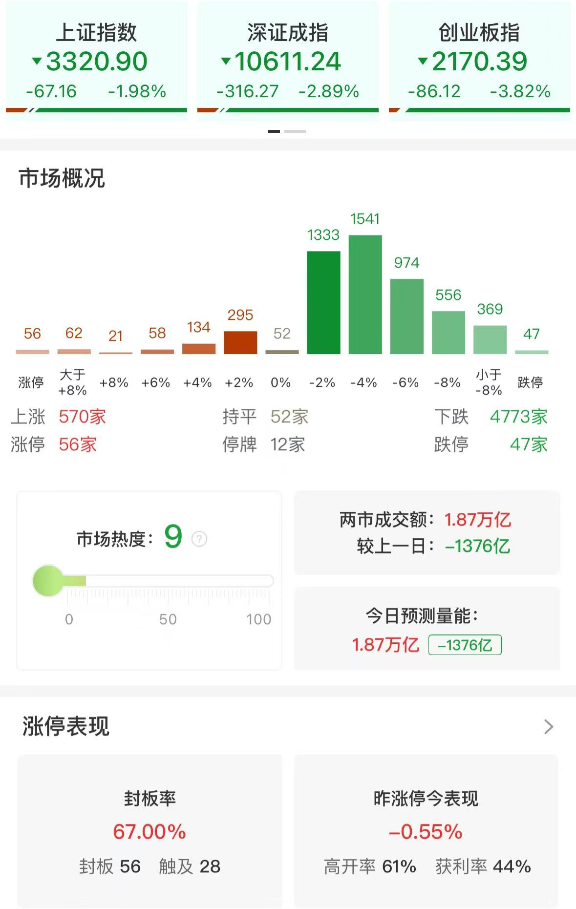 财联社2月28日电,今日是本月最后一个交易日,本月各大主要指数月线均收红,其中沪指本月累计涨超2%,科创50指数大涨12.95%,北证50指数大涨23.53%。今日盘面上,指数全天低开低走,创业指数领跌。市场热点较为匮乏,个股普跌,全市场超4700只个股下跌,近200股跌超9%。沪深两市全天成交额1.87万亿,较上个交易日缩量1376亿。从板块来看,油气股逆势走强,准油股份涨停。大消费股局部活跃,海南椰岛等涨停。下跌方面,两大主线机器人和算力集体大跌,中大力德等多股跌停。板块方面,油气、白酒等少数板块上涨,机器人、CPO、铜缆高速连接、通信设备等板块跌幅居前。截至收盘,沪指跌1.98%,深成指跌2.89%,创业板指跌3.82%。