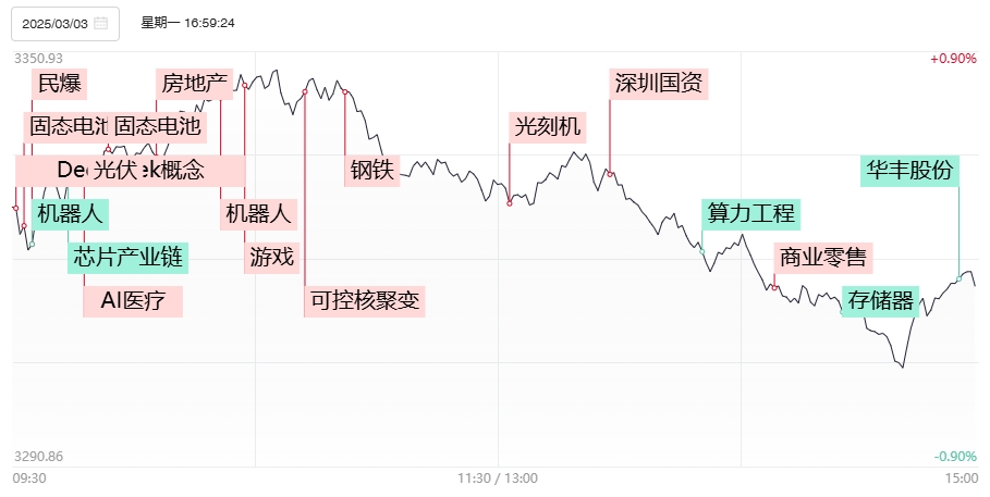 财联社3月4日电,市场全天冲高回落,三大指数涨跌不一。个股涨多跌少,全市场超3200只个股上涨。沪深两市全天成交额1.62万亿,较上周五缩量2423亿。1)梅赛德斯-奔驰与FactorialEnergy合作研发的锂金属阳极固态电池首次应用于量产车平台,标志着固态电池向商业化迈出关键一步。固态电池概念持续站上风口,其中设备、材料作为先行受益方向继续得到资金挖掘,上海洗霸晋级3连板,北交所武汉蓝电、力王股份等多股涨停,并进一步扩散向钠离子电池以及传统锂电方向。2)DeepSeek3月1日发表题为《DeepSeek-V3/R1 推理系统概览》的文章,披露理论成本利润率为545%。更多企业能够以更低的成本实现高效的推理部署趋势下,AI应用端早盘展开积极修复,赛意信息直接以涨停价开盘,进而带动云鼎科技、鼎捷数智、用友网络等ERP概念股盘中大幅冲高。而此前风光无限的云计算、数据中心等方向受到推理侧短期降本的利空拖累展开大面积补跌,杭钢股份2连跌停,优刻得、并行科技、首都在线等纷纷位居跌幅前列。3)《北京具身智能科技创新与产业培育行动计划(2025-2027年)》印发,机器人概念持续内部高低切,高位股中大力德2连跌停,五洲新春等前期核心人气品种继续展开补跌,而征和工业晋级2连板,长荣股份等低位品种继续得到资金挖掘展开补涨。4)2月29日,中国核电、浙能电力相继公告,拟以增资方式参股中国聚变能源有限公司,分别投资10亿元、7.5亿元。受此消息刺激,可控核聚变概念全天逆势活跃,中国核建、永鼎股份、联创光电等多股涨停。