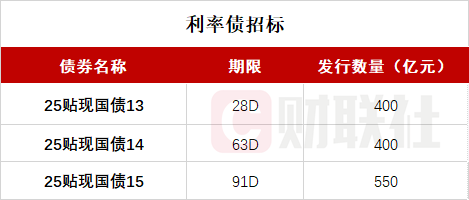 财联社3月5日电,按照此前公布的发行计划,财政部将于上午10:35-11:35招标发行三期国债,分别为:2025年记账式贴现(十三期)国债,期限28D,发行量不超过400亿元;2025年记账式贴现(十四期)国债,期限63D,发行量不超过400亿元;2025年记账式贴现(十五期)国债,期限91D,发行量不超过550亿元。