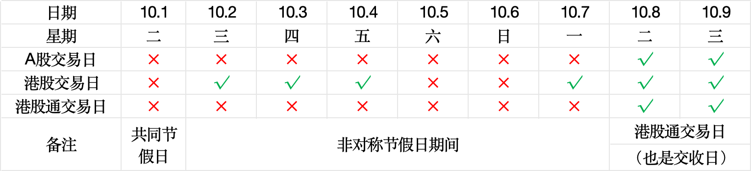 (1)如果某港股上市公司的股权登记日是2024年10月2日(“非对称节假日期间第一个港股交易日”)的话,那么境内股权登记日为2024年10月8日(“非对称节假日后第一个港股通交收日”);