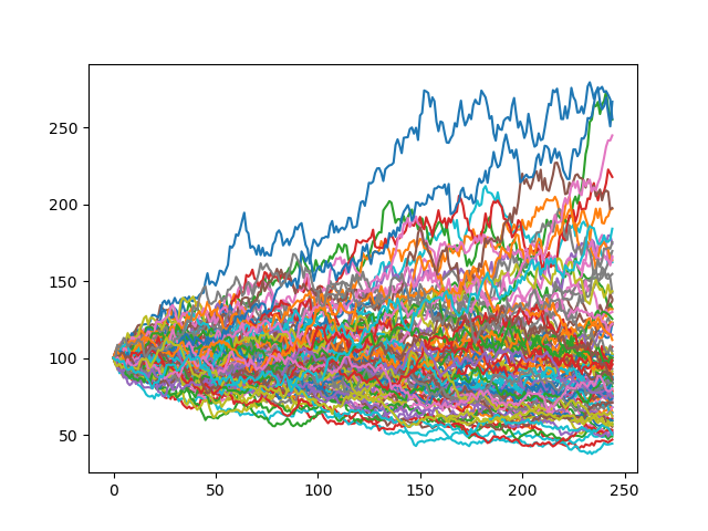 很显然,在风险中性世界中,投资者的期望收益率是确定的,那么期权未来现金流的期望是确定的吗?这里就需要回顾一下我们在“期权定价公式”一章中介绍的几何布朗运动了。如下图所示,几何布朗运动假定每一步的收益率都服从正态分布,因而使股票价格服从对数正态分布。在几何布朗运动的假设下,我们如果知道资产收益率的期望和波动率,那么很容易用一个数学公式表达出资产价格的最终概率分布。因此,期权未来现金流的期望其实也是确定的。