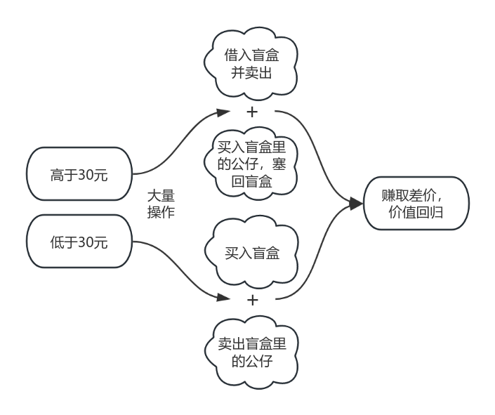 当然,现实中一定是存在交易摩擦的,比如做空限制。具体到盲盒这个商品上,上图中“借入盲盒”这一举动就稍稍有点脱离现实了,至于再把公仔塞回盲盒里,更属于痴人说梦。但是,当你把盲盒换成流动性更好,交易方式更加自由的金融产品,这种套利则未必不能实现。