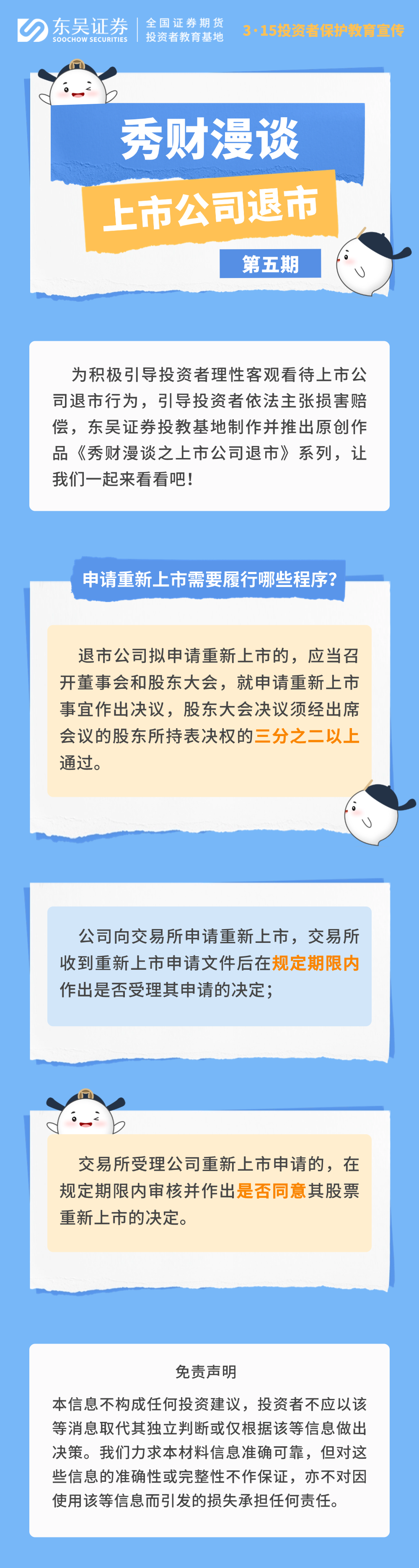 为积极引导投资者理性客观看待上市公司退市行为,引导投资者依法主张损害赔偿,东吴证券投教基地制作并推出原创作品:秀财漫谈之上市公司退市系列,让我们一起来看看吧!