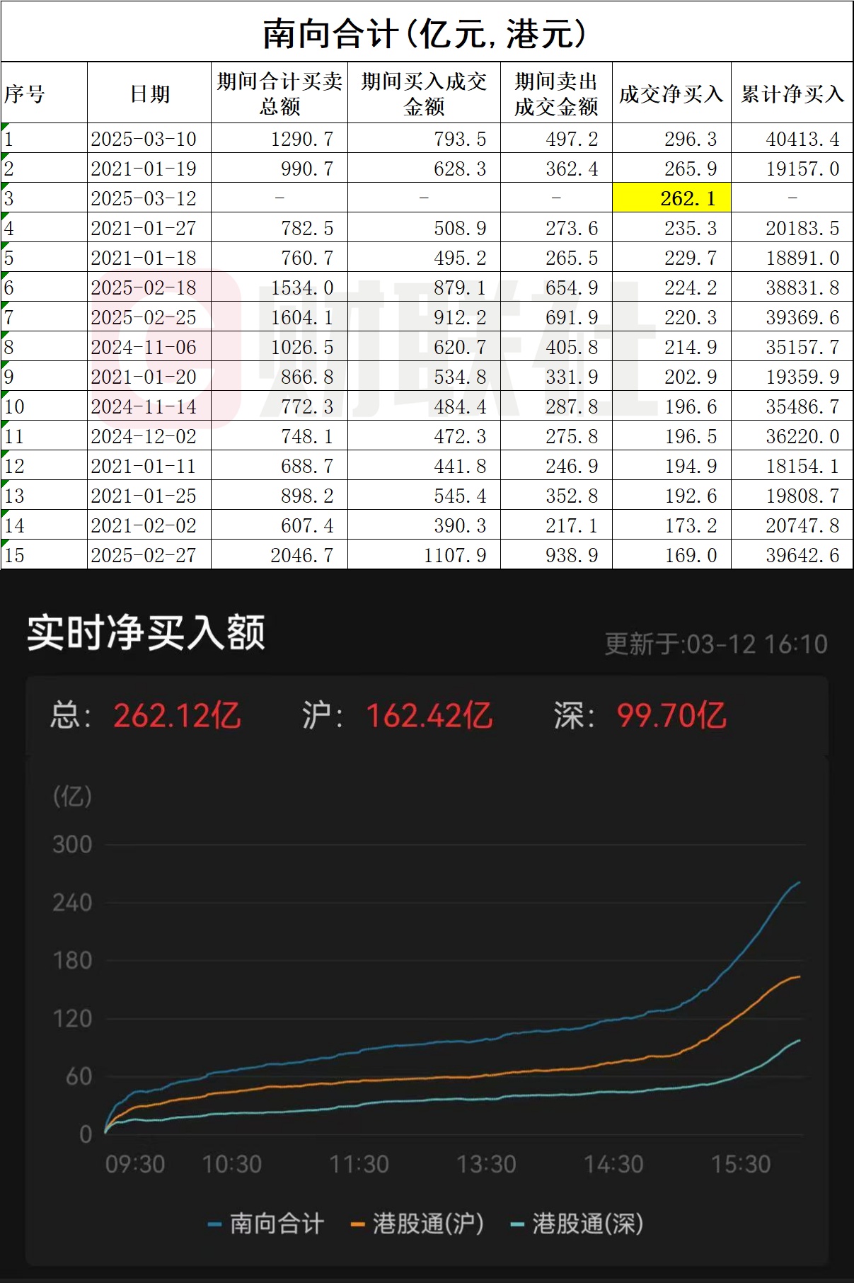 财联社3月12日电,港股高开低走,香港恒生指数跌0.76%,恒生科技指数跌2.04%。南向资金单日净买入262.12亿港元,为历史第三高。哔哩哔哩跌超6%,华虹半导体跌超4%,小米集团跌超3%,东方甄选、京东集团跌超2%,美团、中芯国际跌超1%。