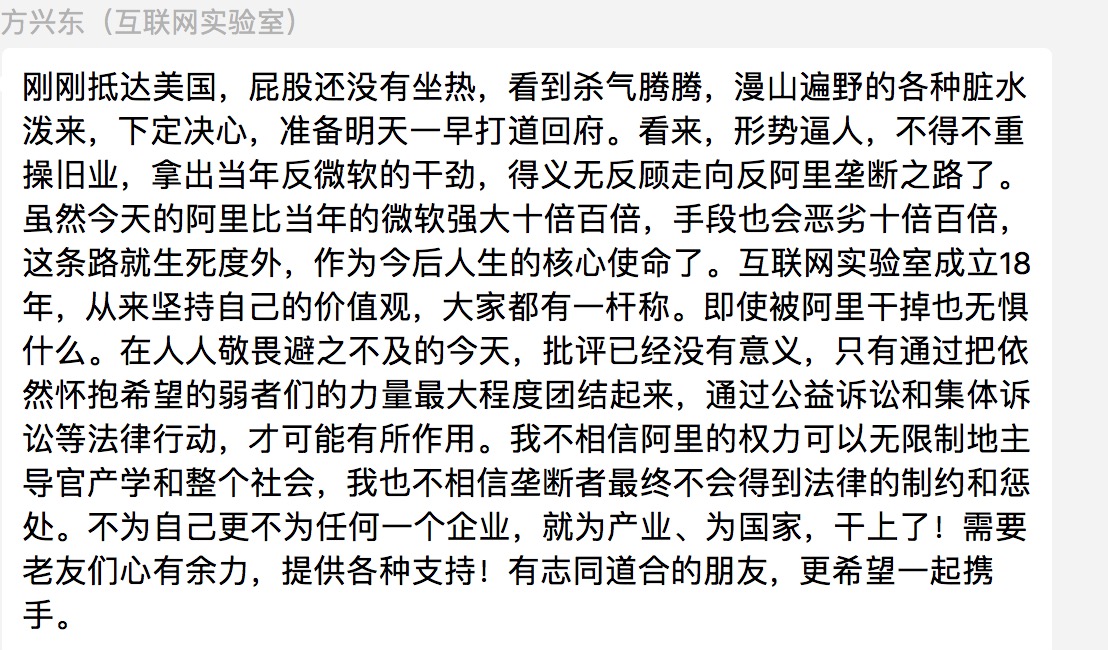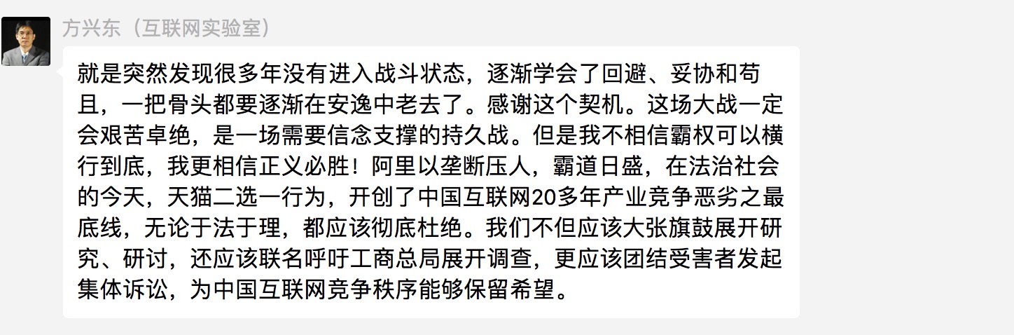 11月24日晚间,方兴东在微信聊天群中正式表示,将重操旧业,拿出当年反微软的干劲,义无反顾地走向反阿里垄断之路。方兴东目前是知名互联网咨询公司互联网试验室创始人、董事长。