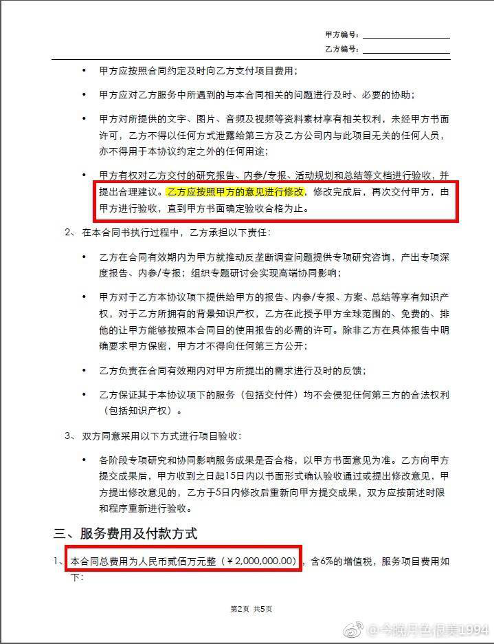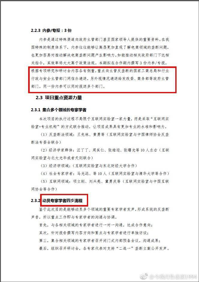 11月23日,微博账号“今晚月色很美1994”曝光一份互联网实验室(创始人方兴东)与京东签订的合同及《推动工商总局对天猫平台“二选一”反垄断立案调查项目建议书》。