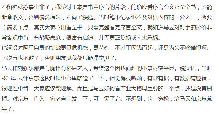 随后,马云在微博和来往向京东发表致歉:不该“童言无忌”。方兴东也表示:不留神就惹事生非了,我检讨!