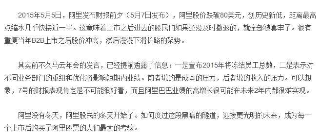 在2015年5月6日,方兴东在中国博客的专栏发表文章《阿里股民的冬天开始了》,对即将公布的阿里业绩表达了悲观态度,并预言未来2年阿里都难以出现业绩高增长。