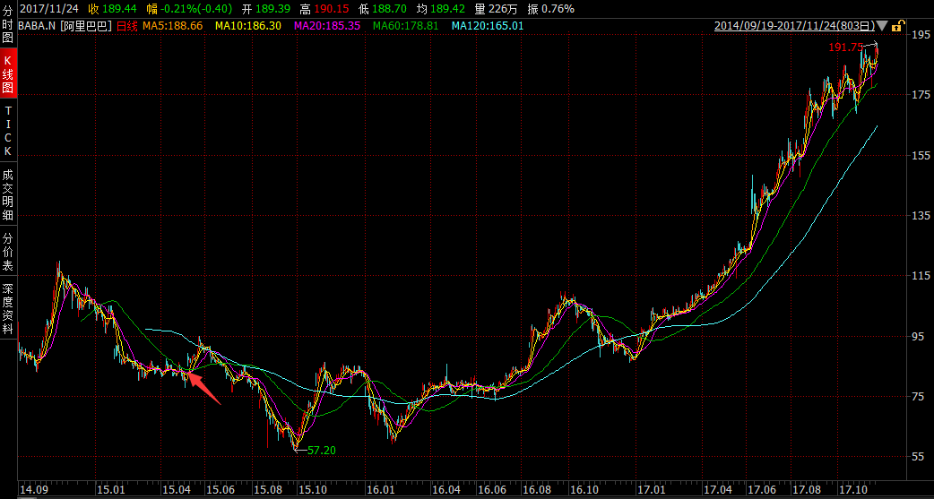 虽然5月7日财报之后,阿里股价出现反弹,但很快重回跌势,最低跌至57美元。但此后的故事大家看股价就可以了(红色箭头处是当时方兴东发表文章之时):