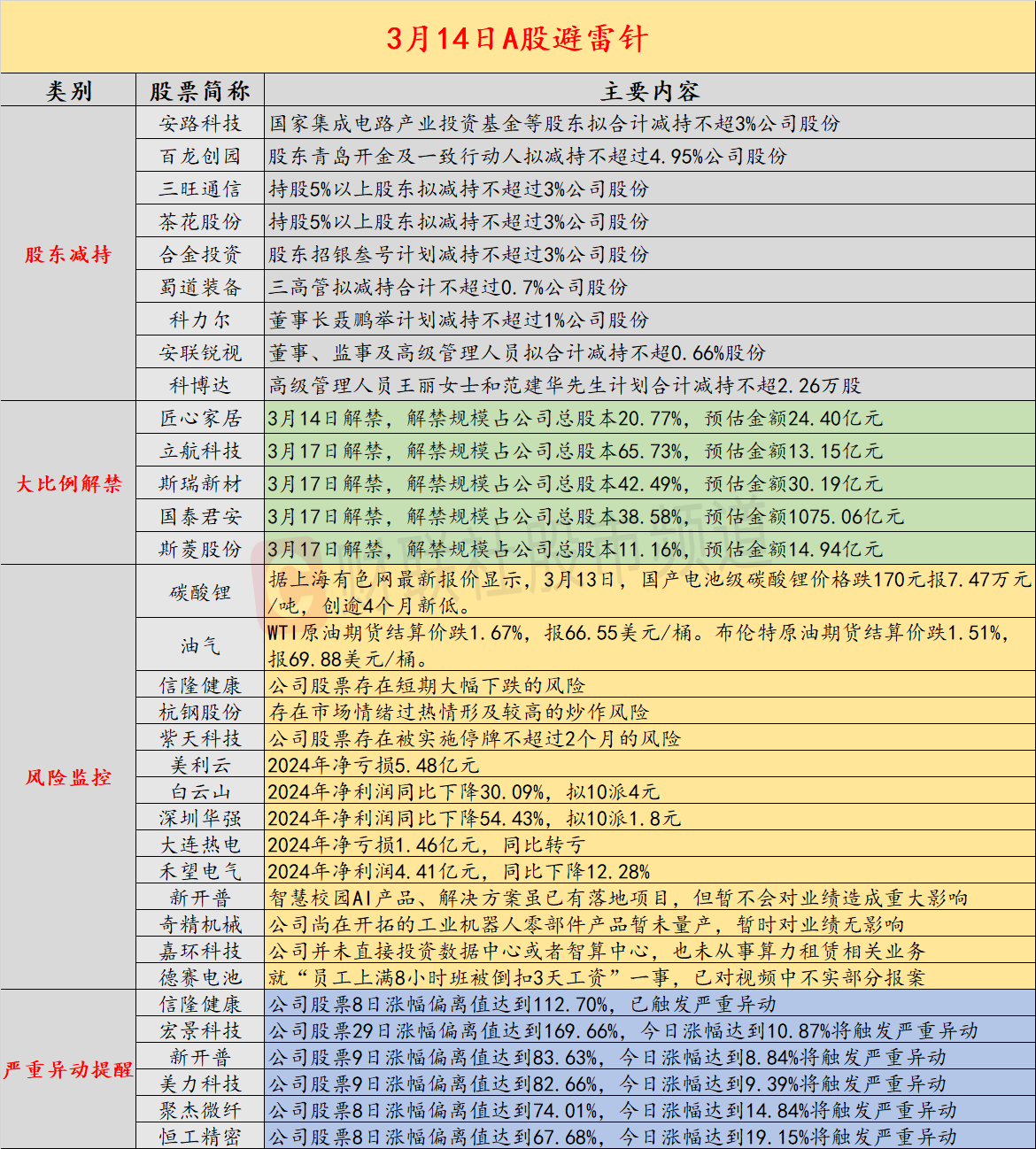 昨日公告的A股拟减持的公司数量较之前有所减少,安路科技股东国家集成电路产业投资基金等股东拟合计减持不超3%公司股份,百龙创园股东青岛开金及一致行动人拟减持不超过4.95%公司股份;立航科技、斯瑞新材将迎来超四成以上解禁;国产电池级碳酸锂价格跌170元,创逾4个月新低;紫天科技公告,公司股票存在被实施停牌不超过2个月的风险;50城新房库存同比下降11%,北京、广州等多个热点城市去化周期仍超过20个月;国资云概念人气股美利云2024年净亏损5.48亿元;美股三大指数集体收跌,大型科技股普跌。