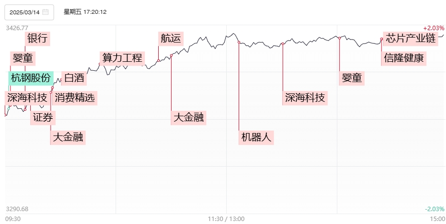财联社3月17日电,市场全天震荡走高,创业板指领涨,沪指重回3400点创年内新高。个股涨多跌少,全市场超4400只个股上涨。沪深两市全天成交额1.79万亿,放量1851亿。1)国新办宣布,将于周一下午3时举行新闻发布会,请有关负责人介绍提振消费有关情况,而内蒙古呼和浩特发布育儿补贴细则。在消息面上双重利好刺激下,乳品股率先爆发,贝因美、新乳业、骑士乳业在内的近20股涨停,进而带动食品饮料为首的大消费板块全线启动,贵州茅台大涨近6%,总市值重返2万亿上方。而午后深圳宣布研究育儿补贴实施方案的消息使得婴童概念热度持续加强,辅助生殖、儿童药品等接连爆发。2)上海、浙江两地先后强调大力发展海洋经济。深海科技概念持续站上风口,东方海洋、中科海讯、宝钛股份、神开股份等大批成分股实现连板晋级。3)2025年3月13日,中国人民银行召开党委扩大会议,明确宣布实施适度宽松的货币政策,并将根据经济金融形势择机实施降准降息措施。在货币政策宽松预期提振下,大金融板块早盘大面积爆发,新华保险、信达证券在内多股涨停,中国银河也一度封板并续创历史新高。4)英伟达将于3月17日-21日举办GTC大会,早盘一度受到杭钢股份等高位股补跌压制的算力产业链展开积极修复,其中英伟达GB300供应链以及交换机方向迎来凌厉补涨,胜宏科技刷新上市新高,方正科技、菲菱科思双双涨停。而柴发、HVDC等数据中心产业链以及算力租赁方向午后也持续展开修复,美利云反包涨停,奥飞数据、朗科科技、首都在线等不同程度大涨。