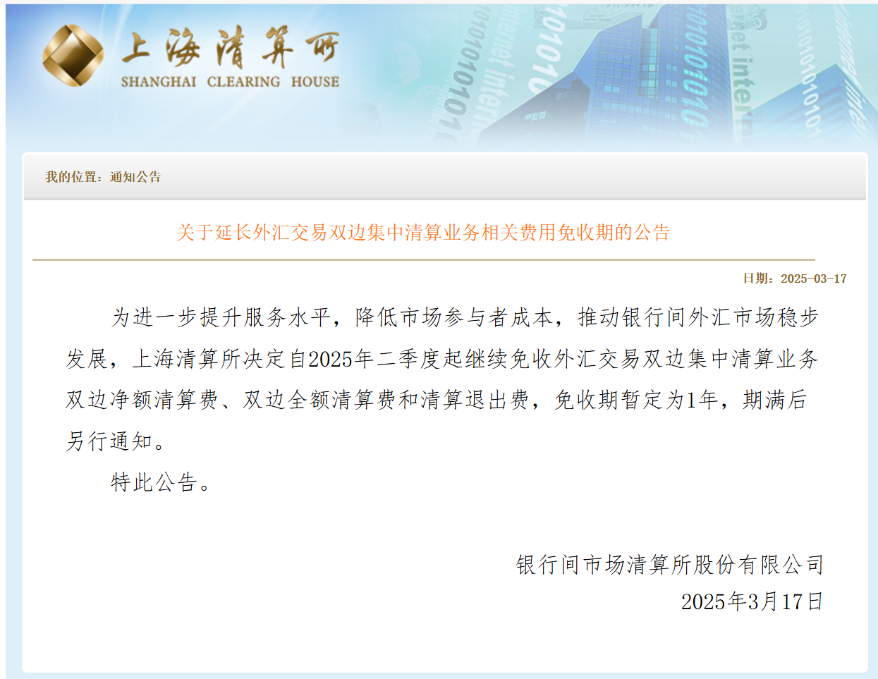 财联社3月17日电,上海清算所决定自2025年二季度起继续免收外汇交易双边集中清算业务双边净额清算费、双边全额清算费和清算退出费,免收期暂定为1年,期满后另行通知。