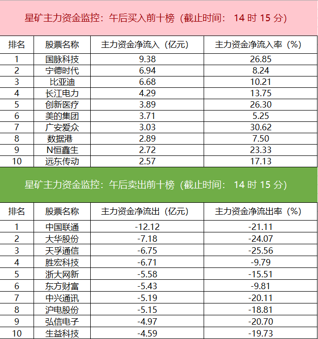 财联社3月19日电,财联社星矿数据显示,今日主力资金净流入交运设备、银行、汽车整车等板块,净流出电子、计算机、通信等板块,其中电子板块净流出超112亿元。个股方面,国脉科技涨停,主力资金净买入9.38亿元位居首位,宁德时代、比亚迪、长江电力主力资金净流入居前;中国联通遭净卖出超12亿元位居首位,大华股份、天孚通信、胜宏科技主力资金净流出额居前。