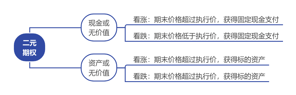 二元期权一般分为两种:现金或无价值(Cash-or-Nothing,又称数字期权)以及资产或无价值(Asset-or-Nothing)。
