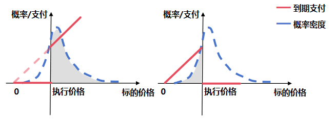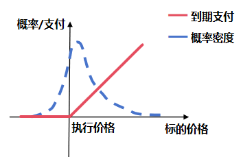 这个公式长得如何复杂或简单并不重要,重要的是在风险中性的框架下我们可以怎样理解它。如下图所示,看涨期权的到期支付(红色实线)是期末标的价格的确定性函数,而在风险中性的框架中,期末标的价格的分布(蓝色虚线)也是确定的。
