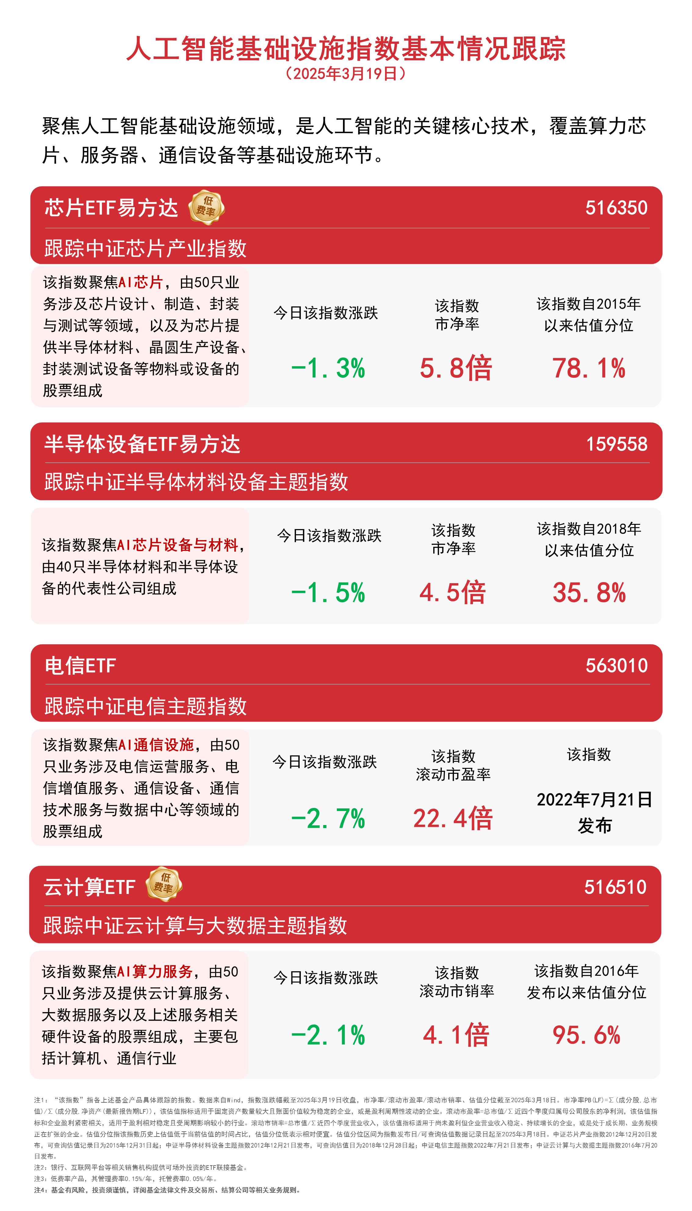 截至收盘,中证芯片产业指数下跌1.3%,中证半导体材料设备主题指数下跌1.5%,中证云计算与大数据主题指数下跌2.1%,中证电信主题指数下跌2.7%。