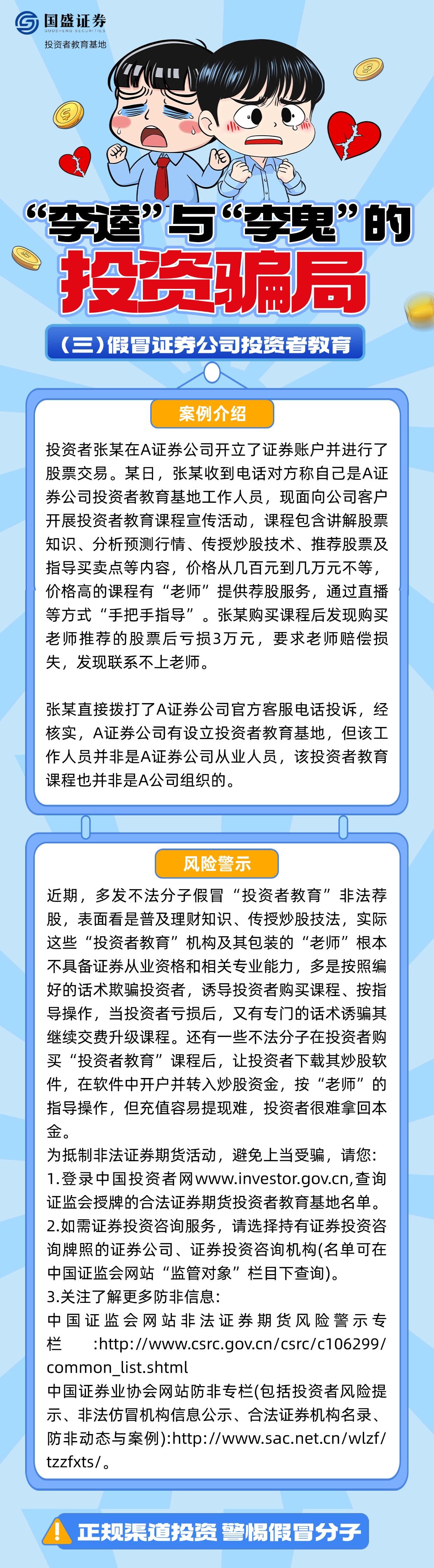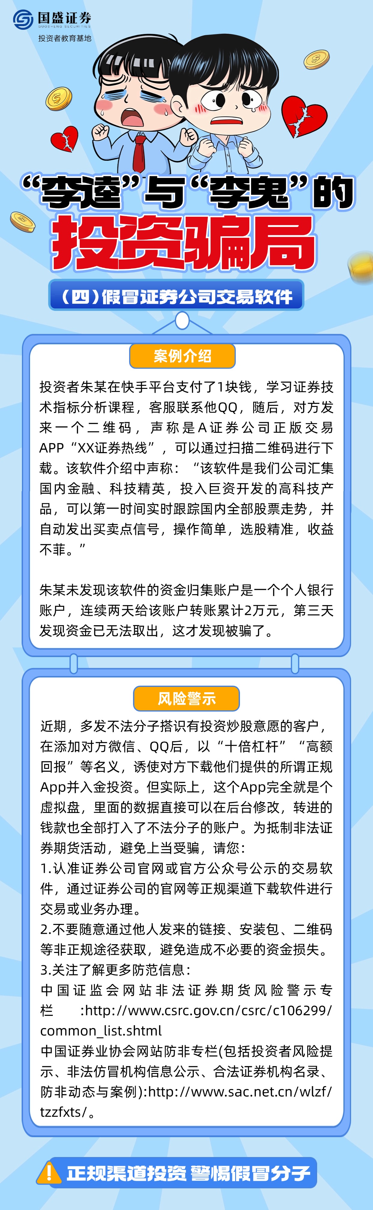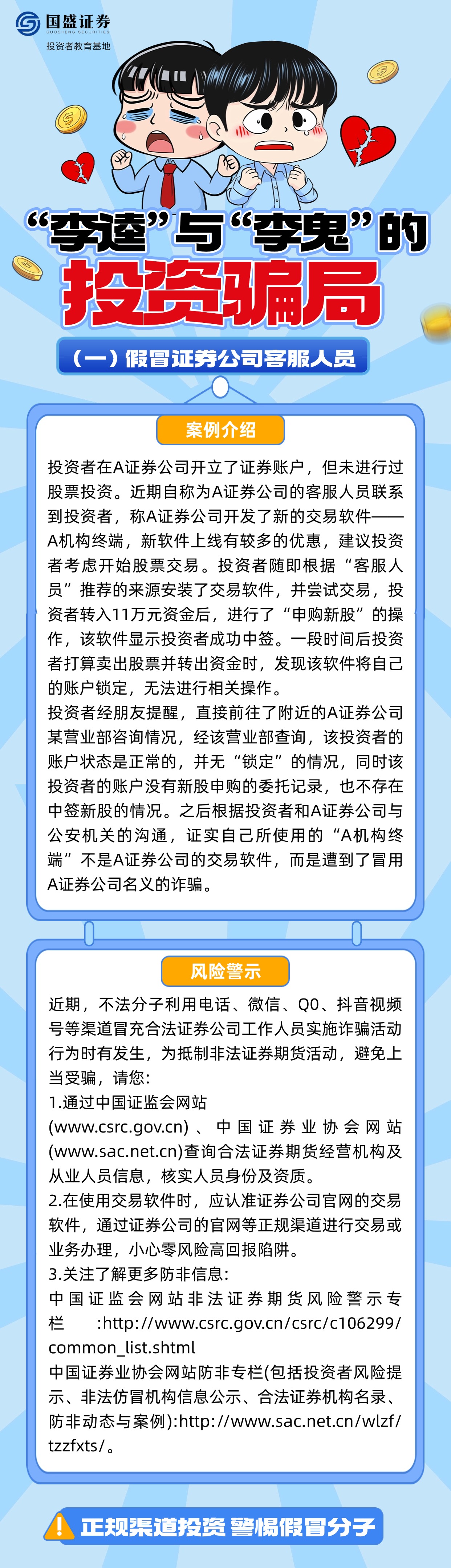 如何辨别“李逵”与“李鬼”?面对假冒券商客服、分析师、虚假交易软件等诈骗套路该怎么办?国盛证券投资者教育基地特推出《“李逵”与“李鬼”的投资骗局》系列图文,结合典型案例解析诈骗过程,帮助投资者增强对非法证券活动的辨识能力,引导其通过正规途径核实信息、维护权益,避免财产损失。