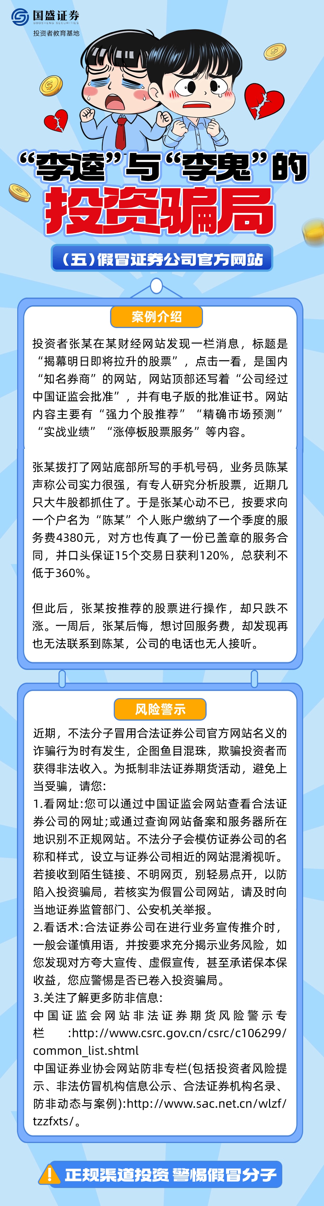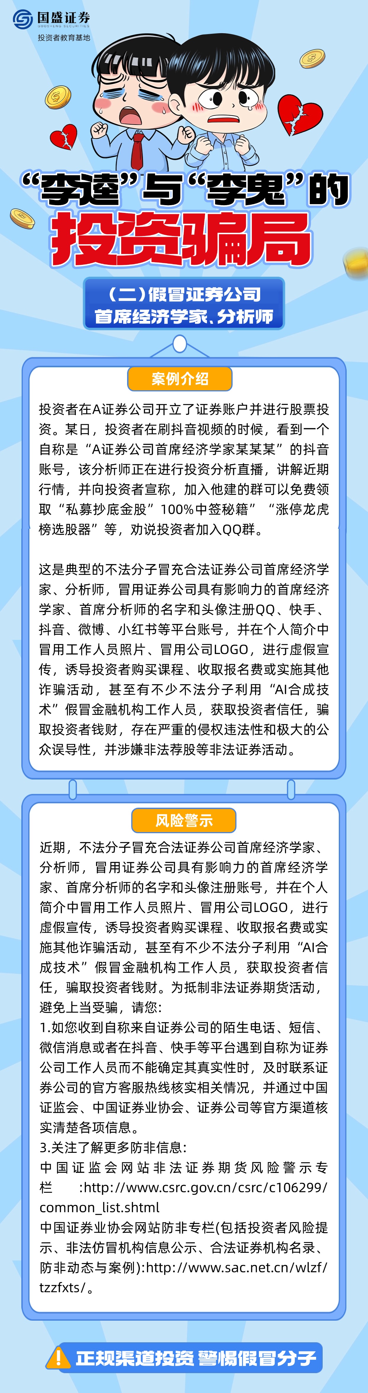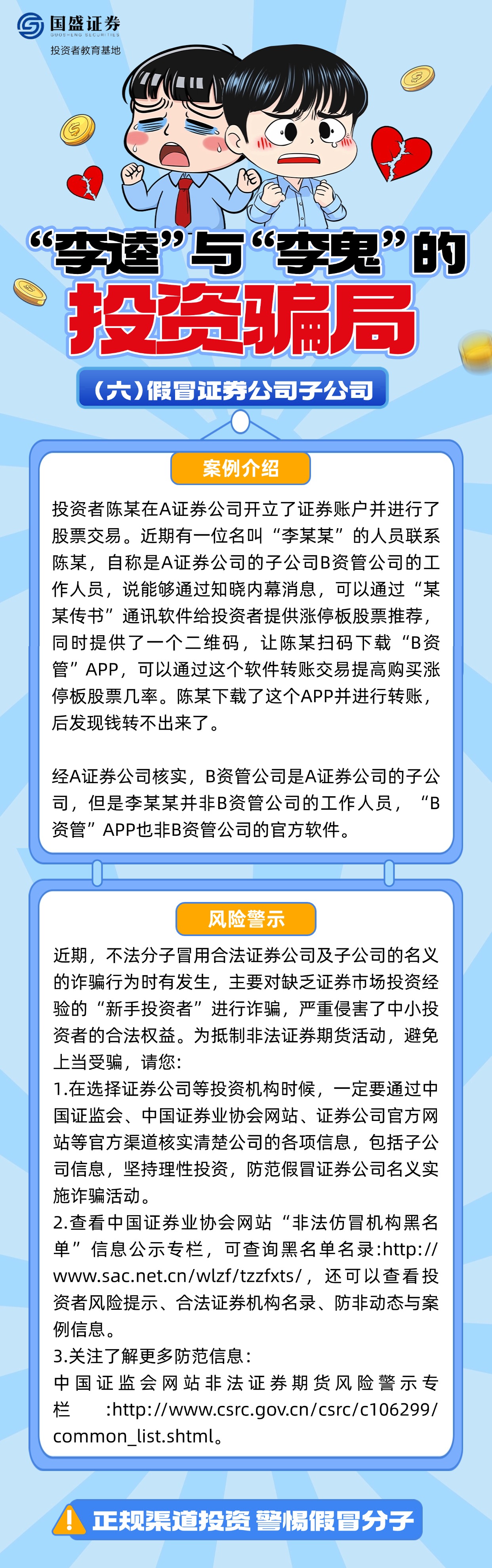 如何辨别“李逵”与“李鬼”?面对假冒券商客服、分析师、虚假交易软件等诈骗套路该怎么办?国盛证券投资者教育基地特推出《“李逵”与“李鬼”的投资骗局》系列图文,结合典型案例解析诈骗过程,帮助投资者增强对非法证券活动的辨识能力,引导其通过正规途径核实信息、维护权益,避免财产损失。