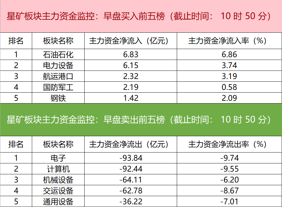 财联社3月21日电,财联社星矿数据显示,今日早盘主力资金净流入石油石化、电力设备、航运港口等板块,净流出电子、计算机、机械设备等板块,其中电子板块净流出超93亿元。个股方面,三维通信涨停,主力资金净买入6.48亿元位居首位,安诺其、中国移动、首都在线获主力资金净流入居前;拓维信息遭净卖出超6亿元,比亚迪、赛力斯、天海防务主力资金净流出额居前。