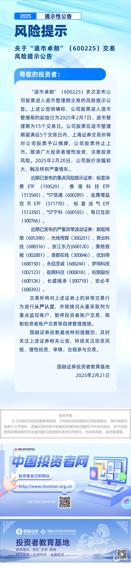 风险提示丨关于“退市卓朗”(600225)交易风险提示公告