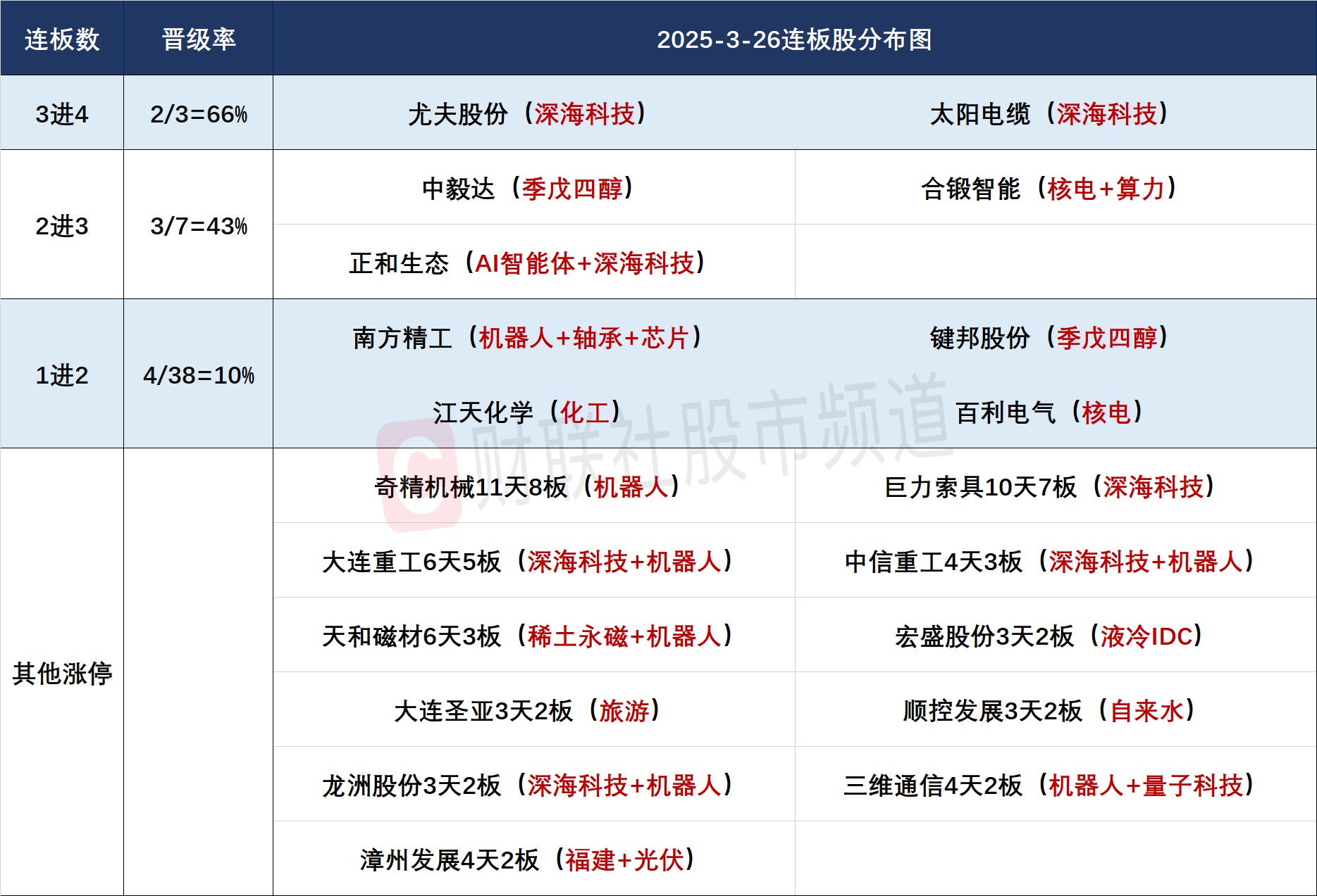 今日共74股涨停,连板股总数9只,其中三连板及以上个股5只,上一交易日共10只连板股,连板股晋级率50%(不含ST股、退市股)。个股方面,全市场超3500只个股上涨,短线情绪有所回暖,奇精机械在3连跌停后获资金回流涨停,巨力索具走出反包行情录得10天7板,中毅达高开高走斩获13天7板。板块方面,深海科技概念反复活跃,巨力索具10天7板,大连重工6天5板,尤夫股份、太阳电缆晋级4连板;以化工为代表的涨价题材持续走强,季戊四醇(中毅达、键邦股份),泰乐菌素(回盛生物、鲁抗医药)等分支表现不俗;机器人板块大幅反弹,奇精机械11天8板,南方精工7天6板,消息面上,2025年3月28日至30日,第二届中国具身智能大会(CEAI 2025)将在北京隆重举行。