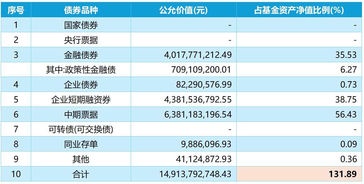 实操中,可以通过定期报告披露的各类资产总额占基金净资产的比重来观察杠杆的大小。下表以某债券基金2024年四季报披露的债券投资组合明细为例,可以看到,该债券基金的债券合计占基金资产净值的比例为131.89%,代表其2024年第四季度末的杠杆为131.89%。