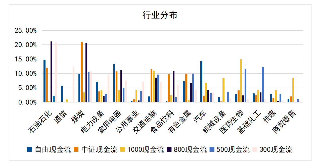 下图总结了这些自由现金流指数的行业分布情况。它们在编制时,为了确保成分股现金流的稳定与可持续性,剔除了现金流波动规律更为复杂的金融与地产行业。具体来看,这些指数的行业分布主要集中在石油石化、煤炭、家用电器等传统行业。这些行业一般相对成熟、市场份额稳定,能够产生持续且稳定的现金流。