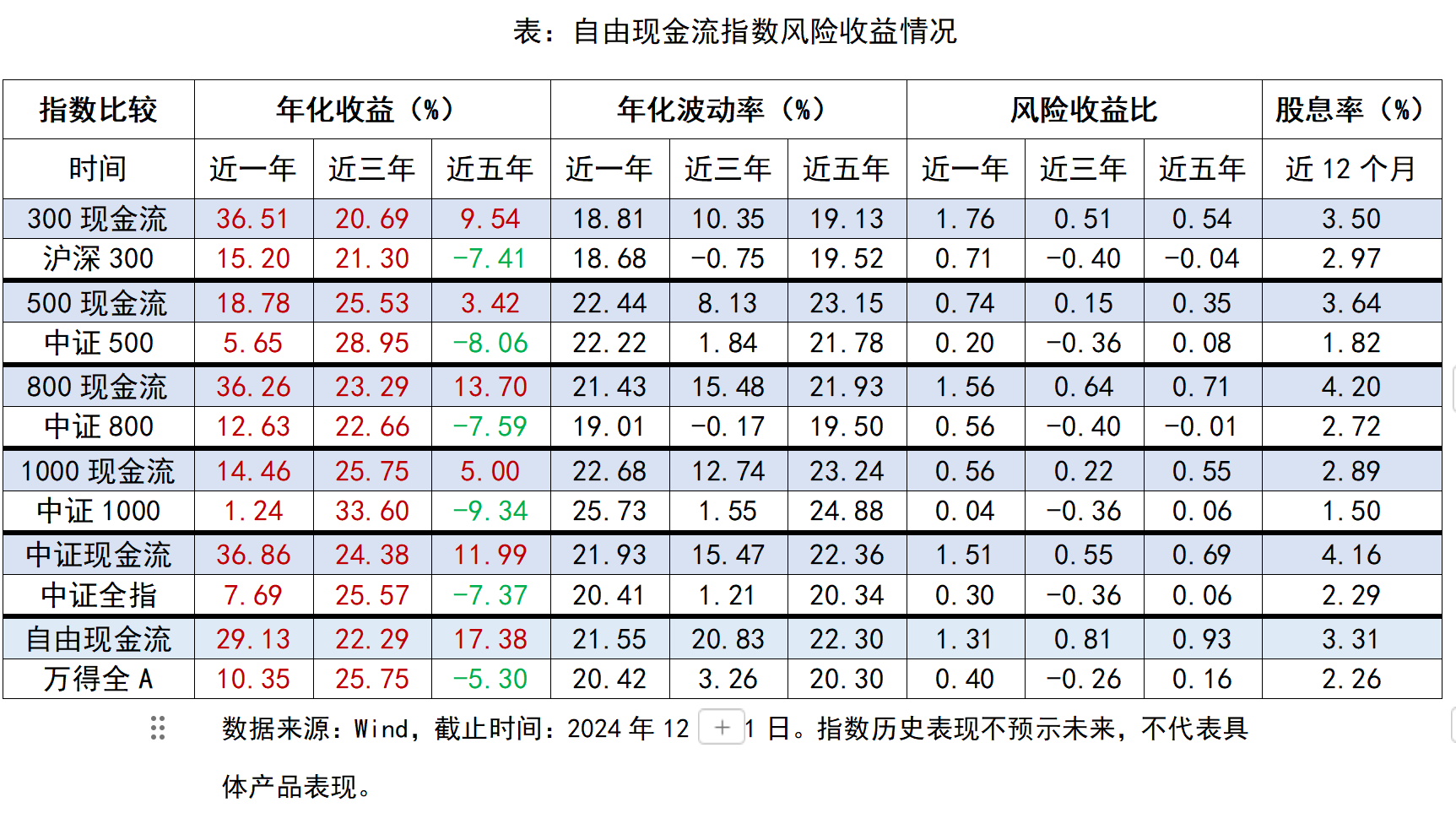 下表数据展示了自由现金流指数和它对应的宽基指数或全市场指数的风险收益情况。以沪深300自由现金流指数为例,截至2024年12月31日,过去一年,其年化收益率高达 36.51%,且风险收益比达到 1.76,远高于沪深 300 指数的 15.20%和0.71,这意味着在承担每单位风险的情况下,该指数为投资者带来了更好的回报。即便将时间拉长至三年和五年,该指数依然保持了更为稳定的年化收益率,且风险收益比均为正数。