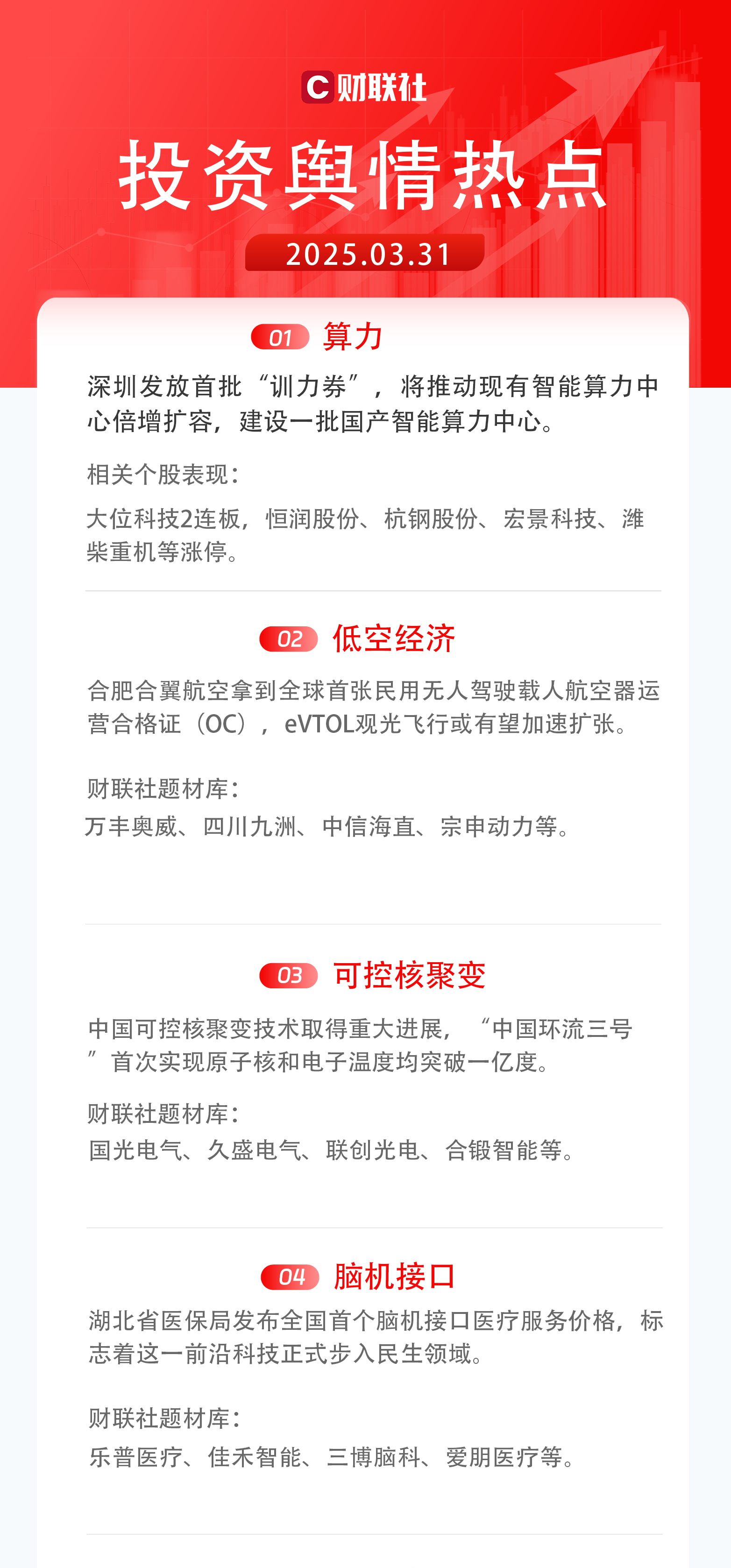 1)算力:深圳3月29日发放首批“训力券”,将推动现有智能算力中心倍增扩容,建设一批国产智能算力中心。