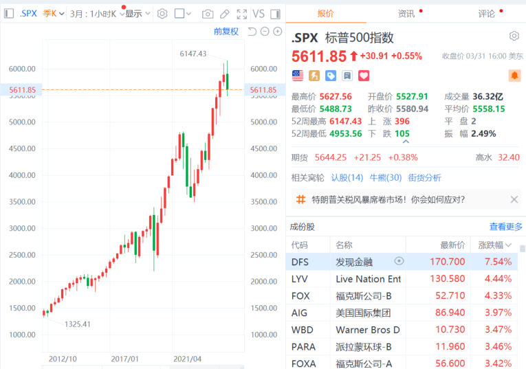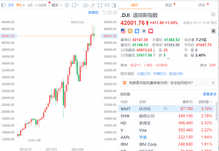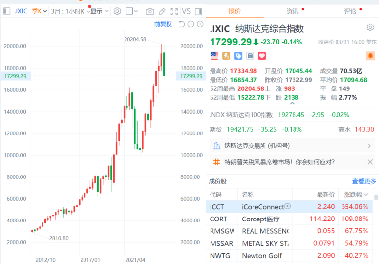财联社4月1日电,美股三大指数收盘涨跌不一,道指涨1%,3月份累跌4.2%,一季度累跌1.28%;标普500指数涨0.55%,3月份累跌5.75%,创2022年10月以来最大单月跌幅;一季度累跌4.59%,创2022年四季度以来最大季度跌幅;纳指跌0.14%,3月份累跌8.21%,创2023年以来最大单月跌幅;一季度累跌10.42%,创2022年三季度以来最大季度跌幅。纳斯达克100指数第一季度下跌8.3%,创2022年第二季度来最差季度表现。大型科技股多数下跌,亚马逊、特斯拉、英伟达跌超1%,微软、奈飞、Meta小幅下跌;苹果涨近2%,谷歌小幅上涨。媒体公司Newsmax美股上市首日大涨735%。